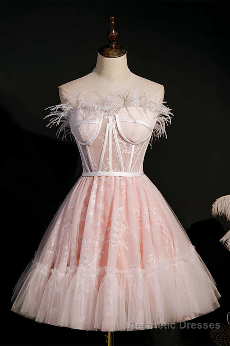 Pink Feather Strapless A-Line Short Homecoming Dress