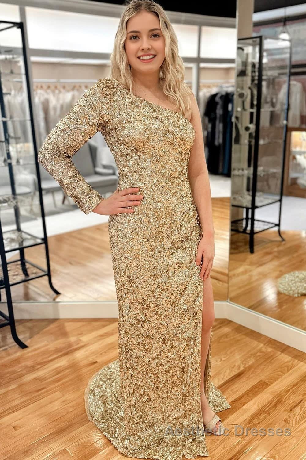 Pink One Shoulder Sequined Prom Dress
