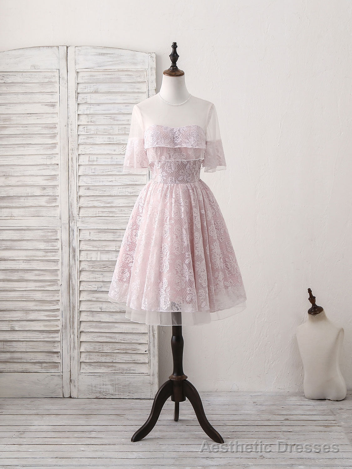 Pink Round Neck Lace Tulle Short Prom Dress, Pink Homecoming Dress