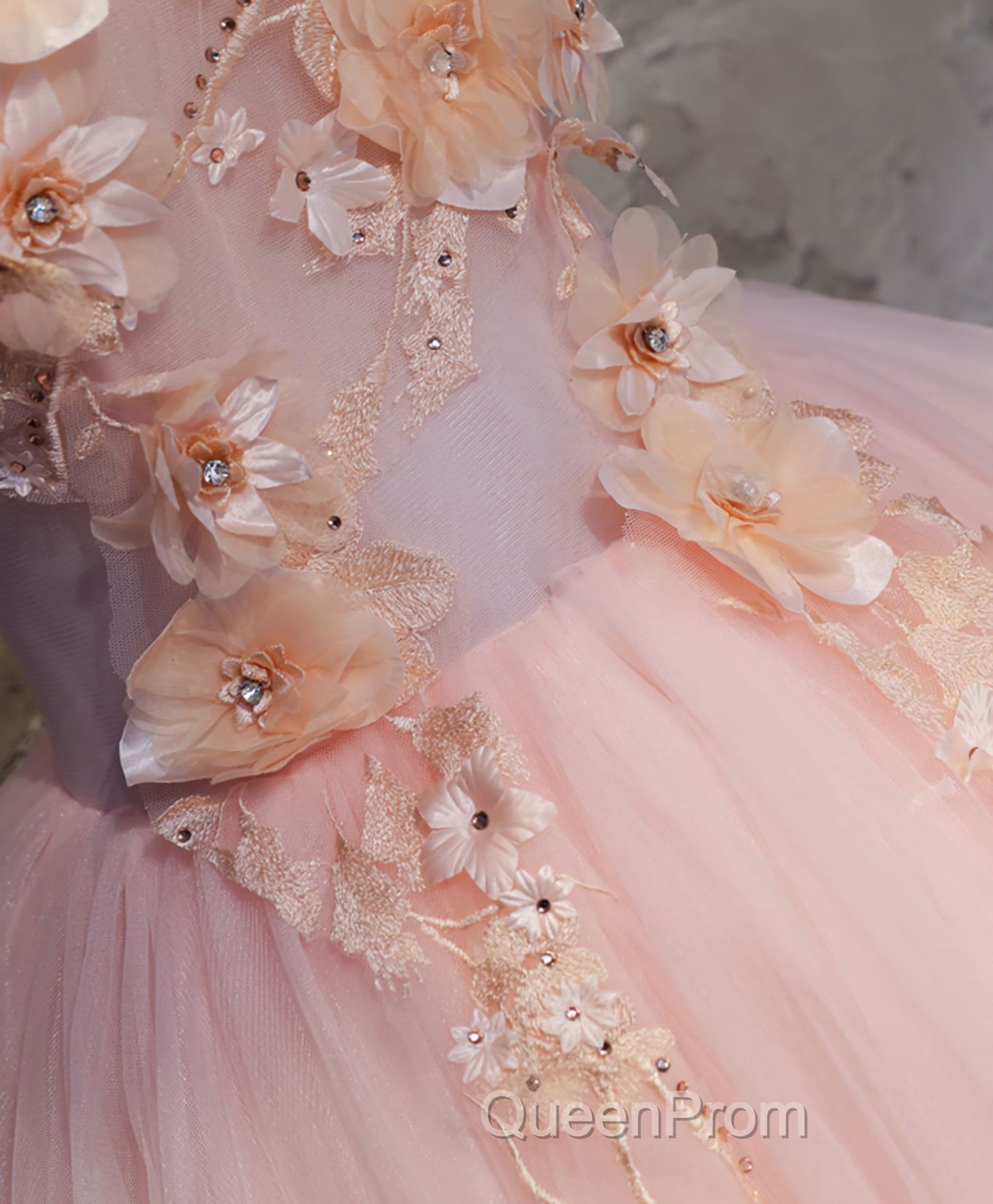 Pink Round Neck Tulle Lace Long Evening Prom Dresses, Lace Formal Dresses