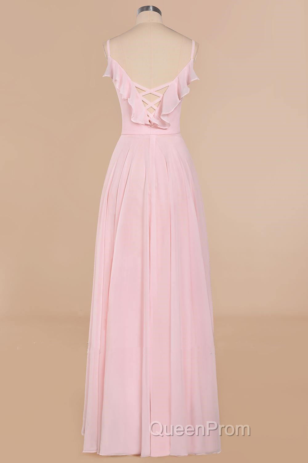 Pink Ruffle Lace-Up A-Line Long Bridesmaid Dresses