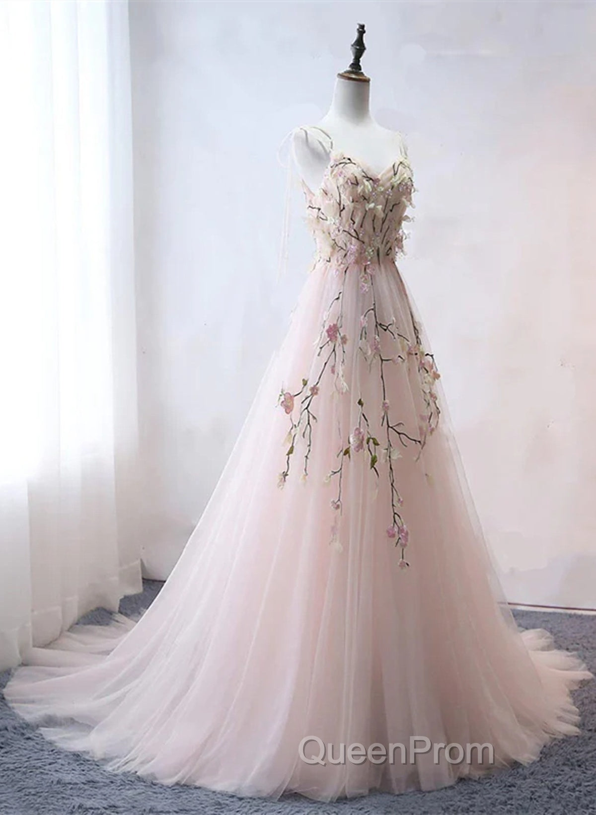 Pink Sweetheart Tulle With Lace Flowers Long Evening Dresses, Pink Tulle Evening Prom Dresses