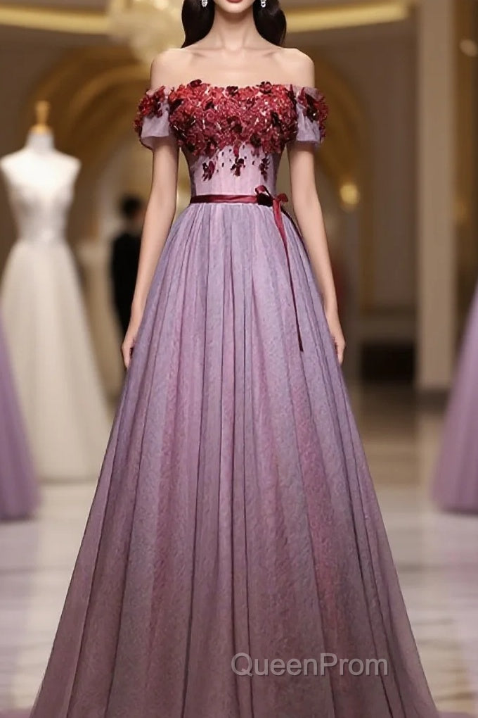 Pink Tulle Lace Applique Long Evening Prom Dresses, Evening Dresses