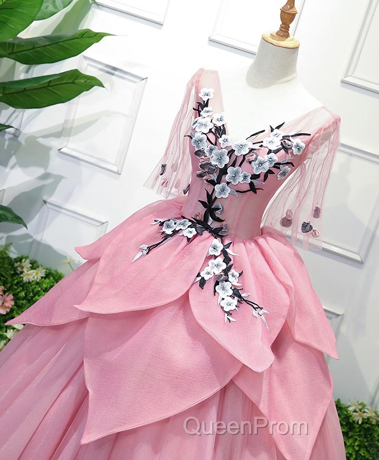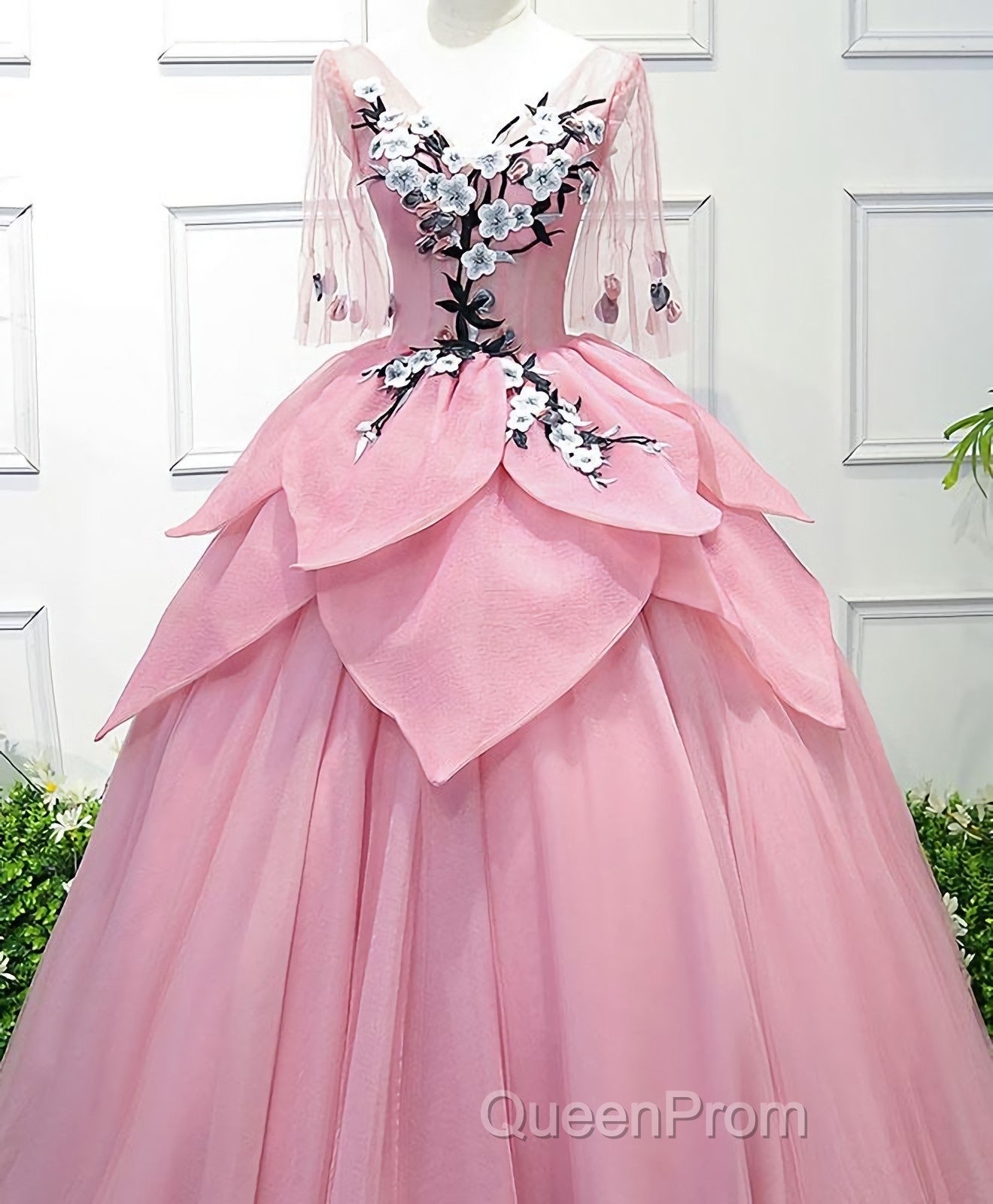 Pink V Neck Tulle Lace Applique Long Evening Prom Dresses, Pink Evening Dresses, 1