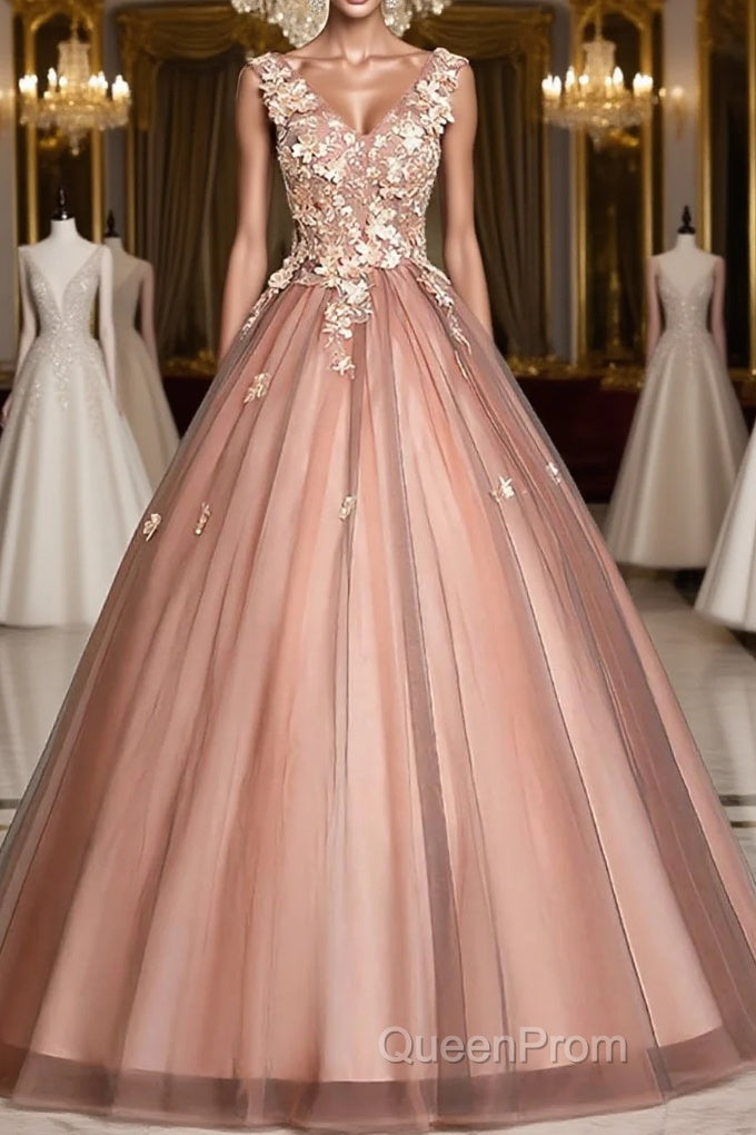 Pink v neck tulle lace long Evening Prom Dresses pink tulle formal Dresses