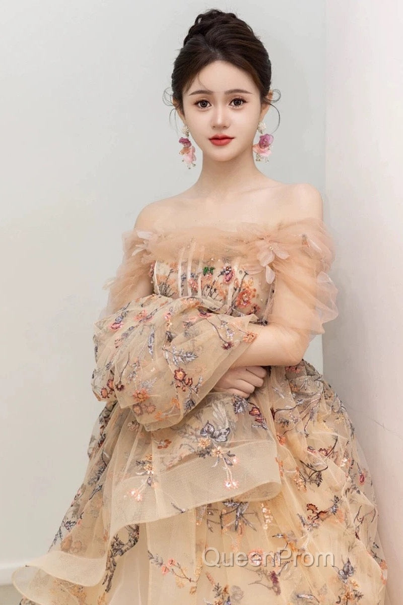 Pretty A Line Off The Shoulder Long Sleeves Floral Tulle Long Length Evening Dresses Evening Prom Dresses