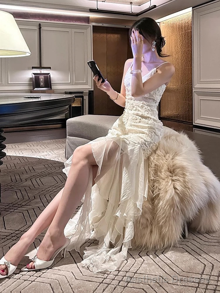 Pretty Mermaid Spaghetti Straps White Floral Prom Dresses Long Evening Gowns