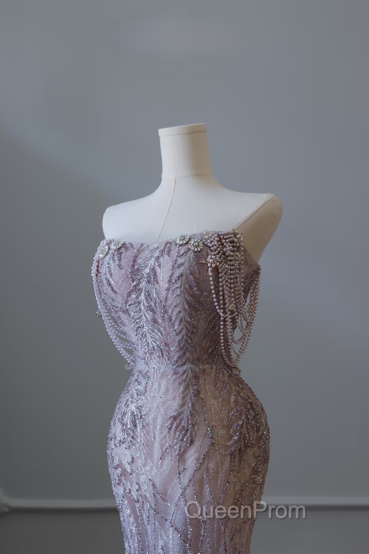 Pretty Mermaid Strapless Lilac Sequin Beads Long Evening Prom Dresses Formal Evening Dresses