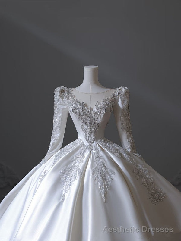 Princess Ball Gown Scoop Neckline Long Sleeves Pleats Beads White Satin Wedding Dresses