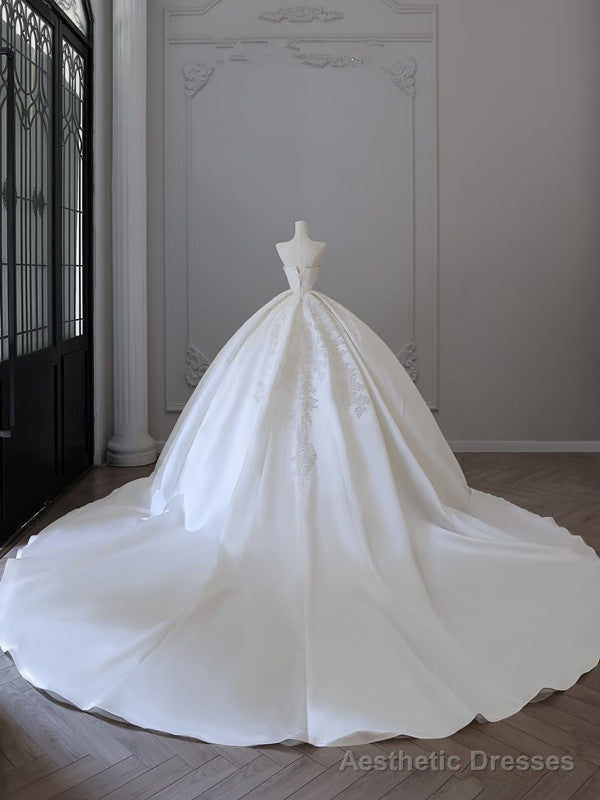 Princess Ball Gown Strapless Sleeveless Pleats White Satin Lace Wedding Dress Bridal Dresses
