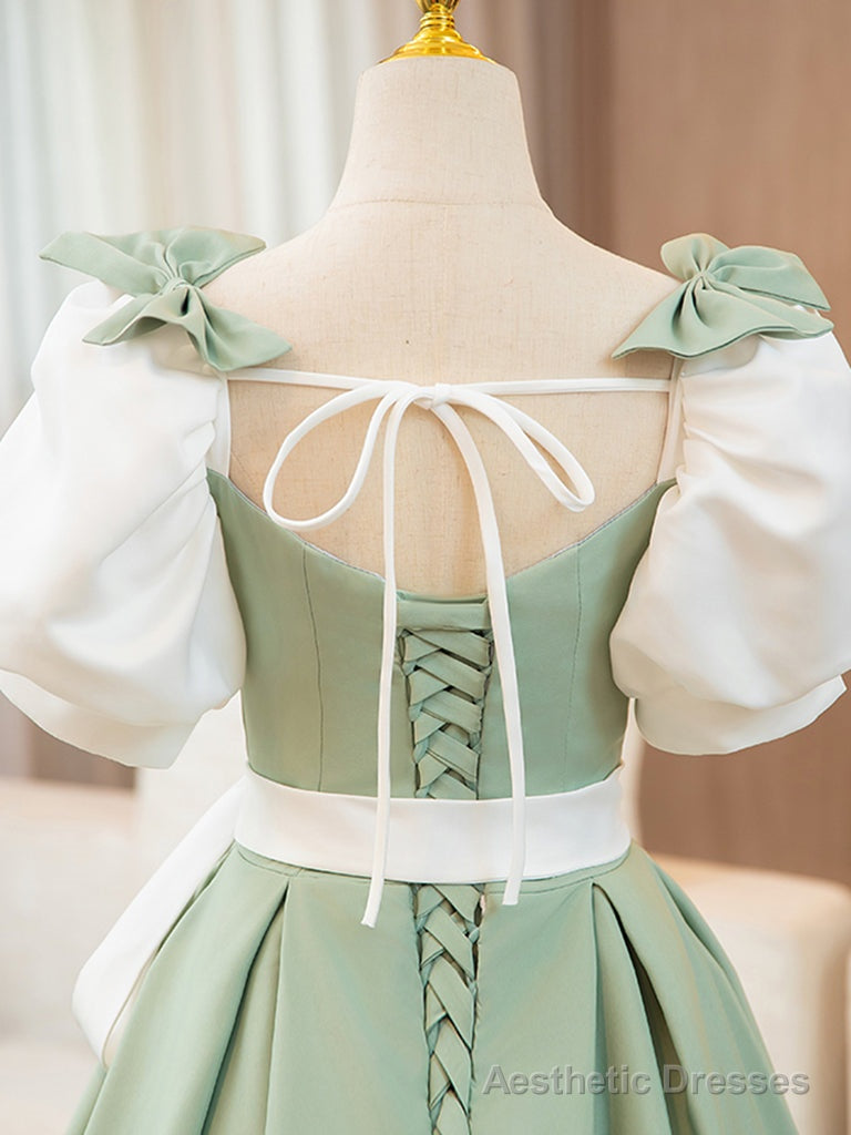 Puff Sleeves A-line Satin Green/White Long Prom Dress, Green Long Formal Dress
