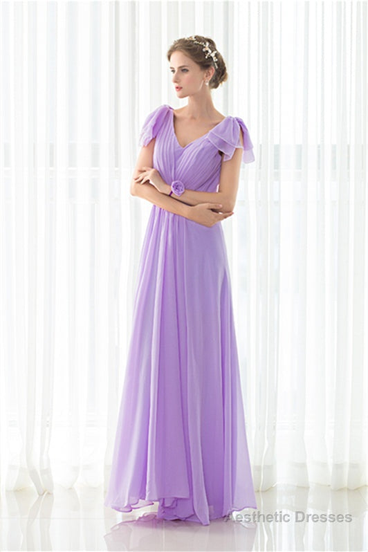Purple Chiffon V-neck Backless Pleats Long Bridesmaid Dresses
