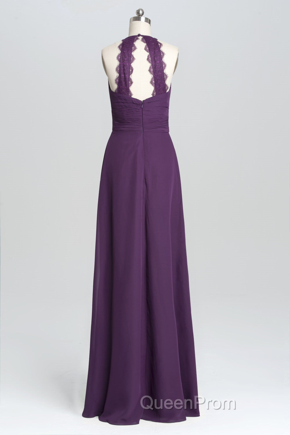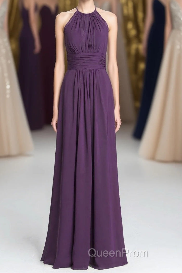 Purple Halter A-line Pleated Long Bridesmaid Dresses