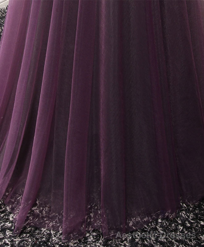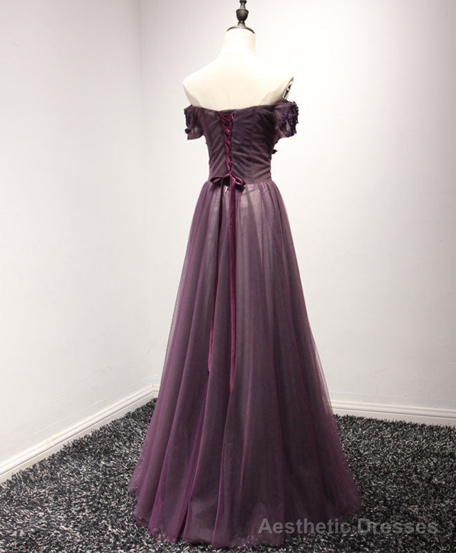 Purple Tulle Lace Off Shoulder Long Prom Dress, Purple Evening Dress