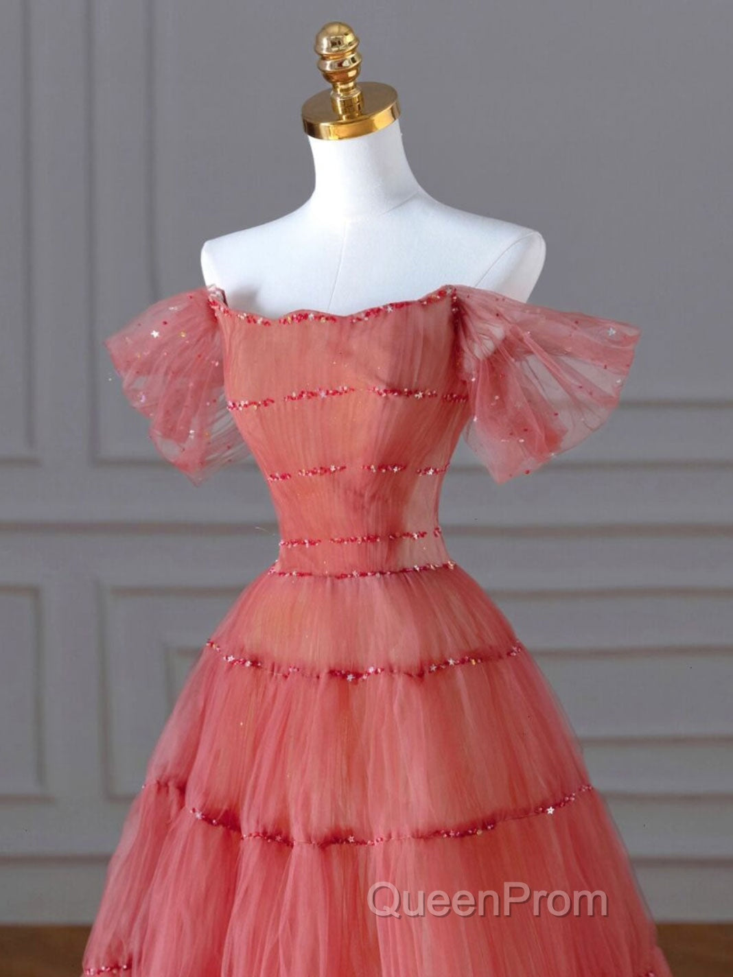 Red Aline Tulle Long Evening Prom Dresses, Red Tulle Formal Graduation Dresses With Beading Sequin