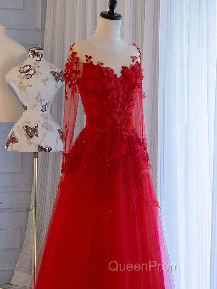 Red round neck tulle lace long Evening Prom Dresses, red evening Dresses
