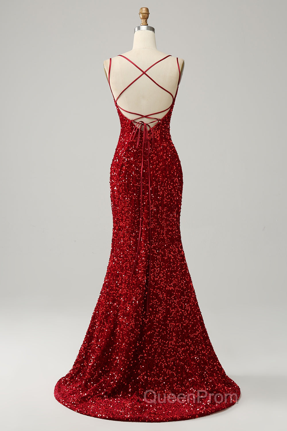 Red Sparkly Mermaid Backless Long Evening Prom Dresses with Fringes