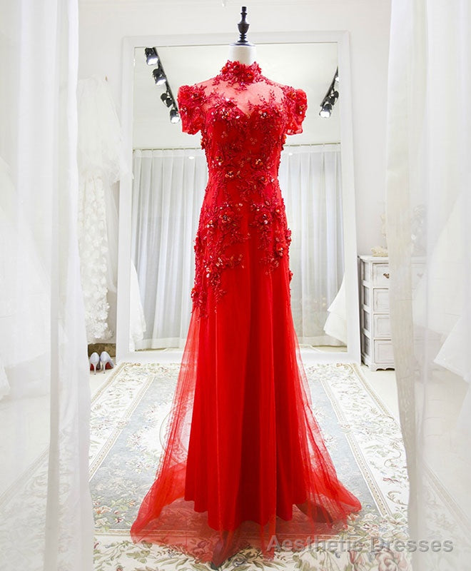 Red Tulle Lace Long Prom Dress, Red Lace Tulle Formal Dress