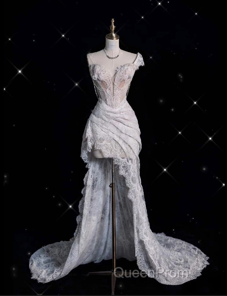 Romantic High Low One Shoulder Lace White Long Wedding Dresses