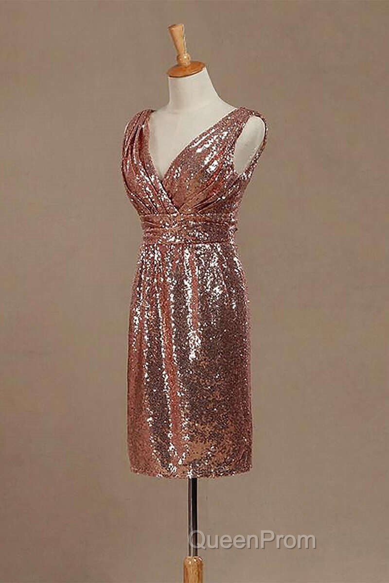 Rose Gold Sequin V-Neck Backless Short Bridesmaid Dresses