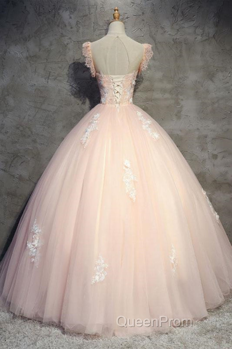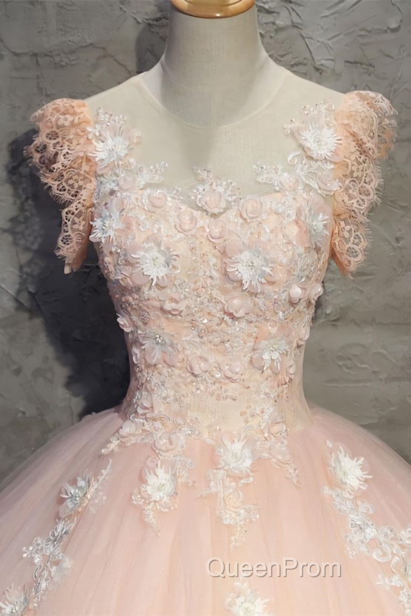 Round Neck Cap Sleeves Lace Pink Long Evening Prom Dresses, Pink Lace Formal Dresses, Pink Evening Dresses, Ball Gown