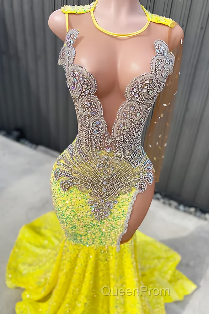Enhance your natural curves with our Round Neck Silver Beaded Mermaid Yellow Sequin Evening Prom Dresses. The intricate beading and sequins add sparkle and shine, while the mermaid silhouette accentuates your figure. Perfect for any special occasion, this Dresses will make you stand out and feel confident.