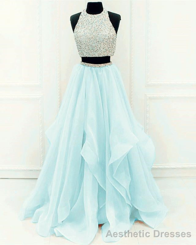 This two piece ball gown features a layered design with sequins and beaded organza, perfect for prom or wedding parties.