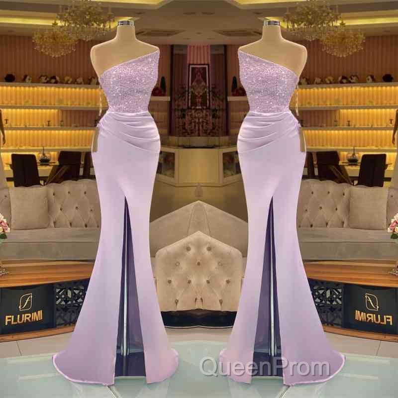 Sequins Formal Dresses Light Purple Mermaid Evening Prom Dresses Long Slit Strapless