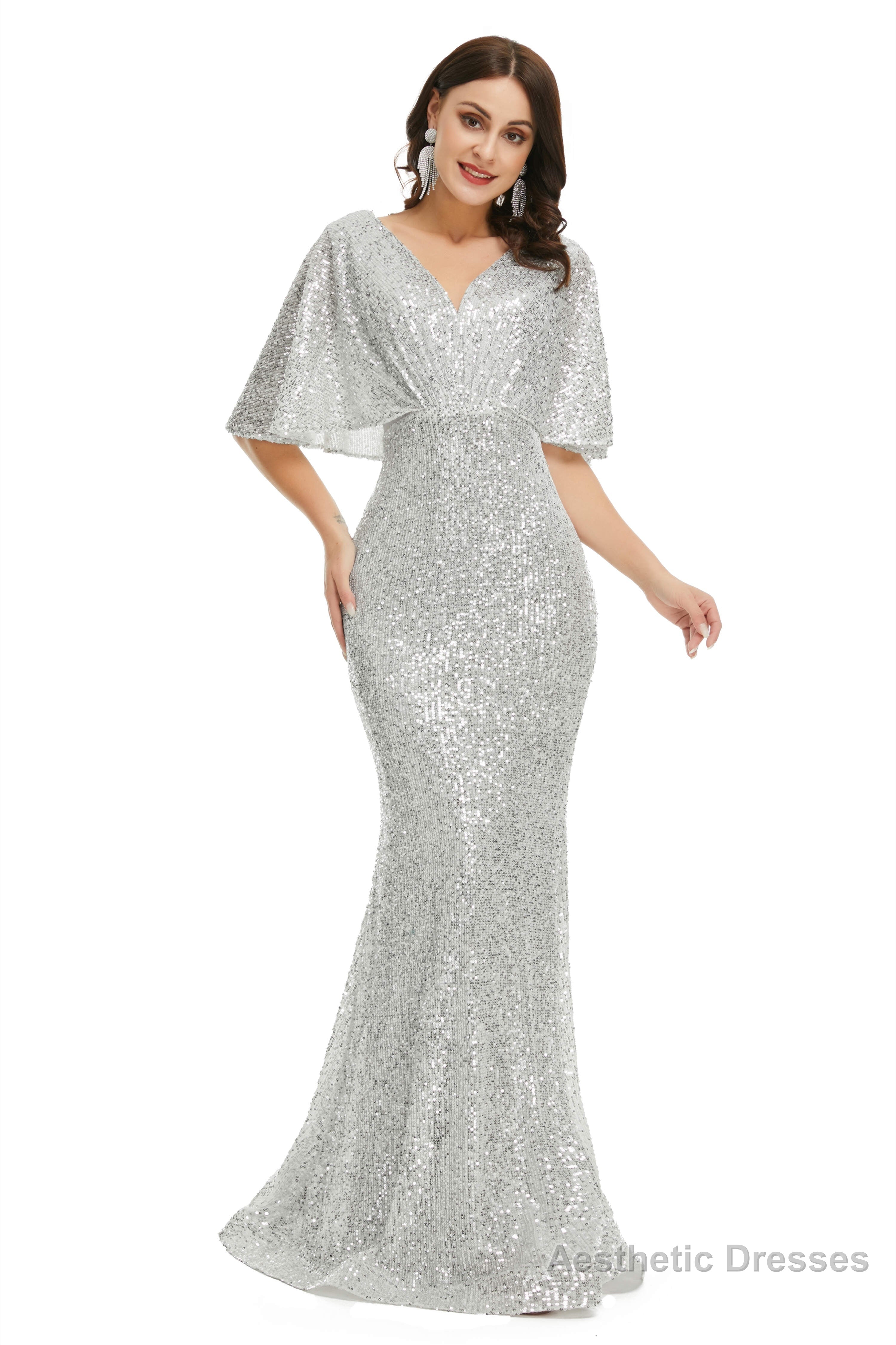 Sequins Mermaid Cape Sleeves V Neck Prom Dresses