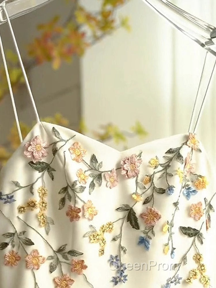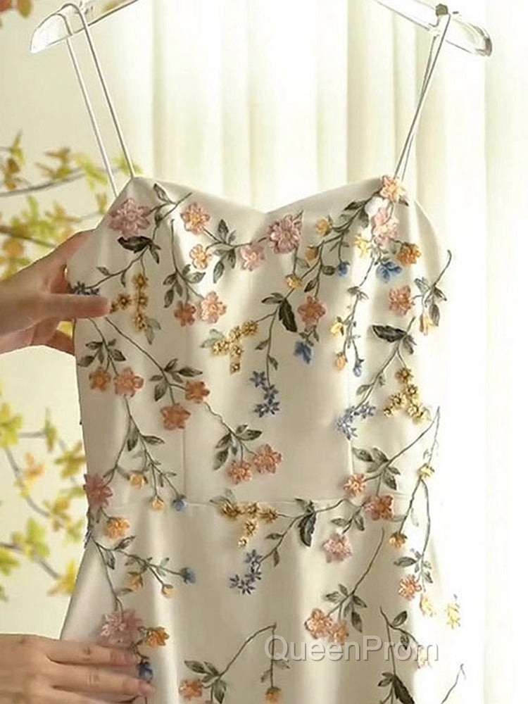 Sexy A Line Spaghetti Straps Ivory Floral Satin Evening Prom Dresses Birthday Outfits Evening Gown