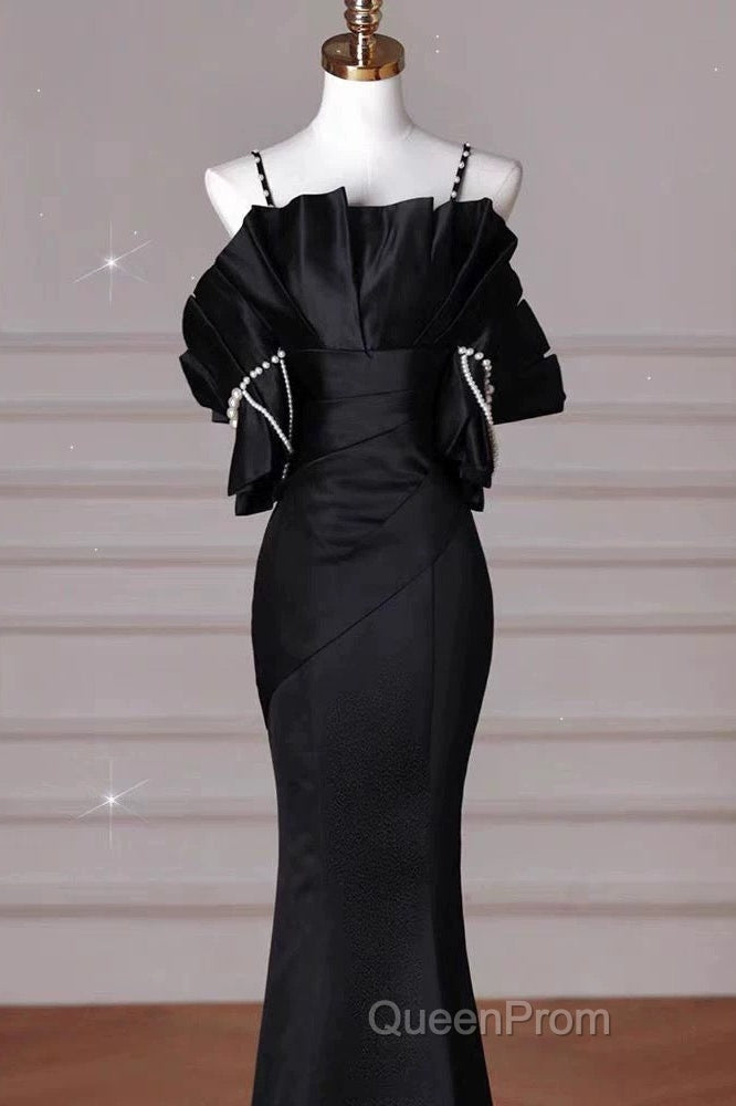 Sexy Mermaid Spaghetti Straps Black Long Formal Dresses Satin Evening Prom Dresses