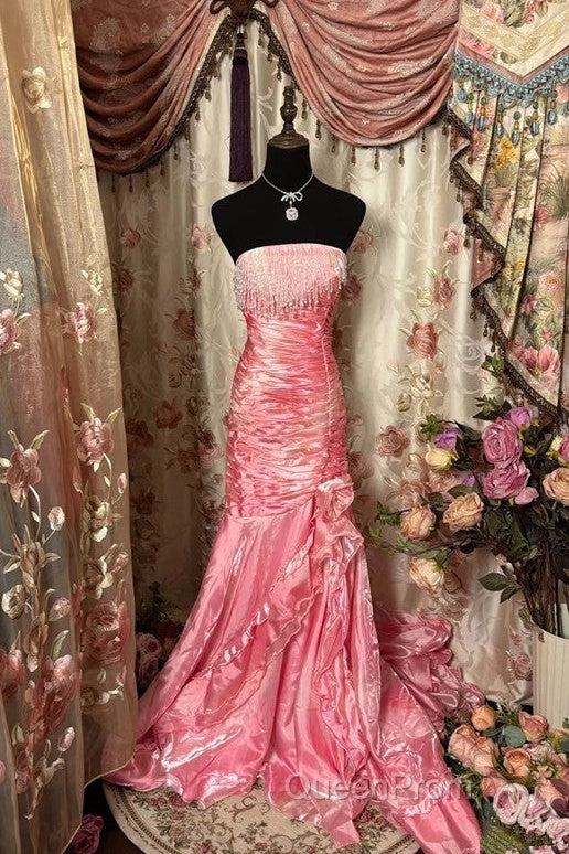 Sexy Mermaid Strapless Pink Satin Long Evening Dresses Party Dresses Evening Prom Dresses