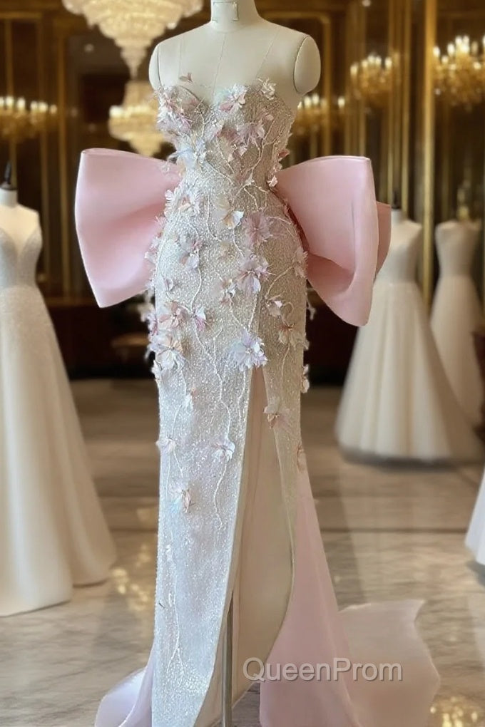 Sexy Mermaid Strapless Pink Sequin Long Floral Evening Prom Dresses Party Dresses