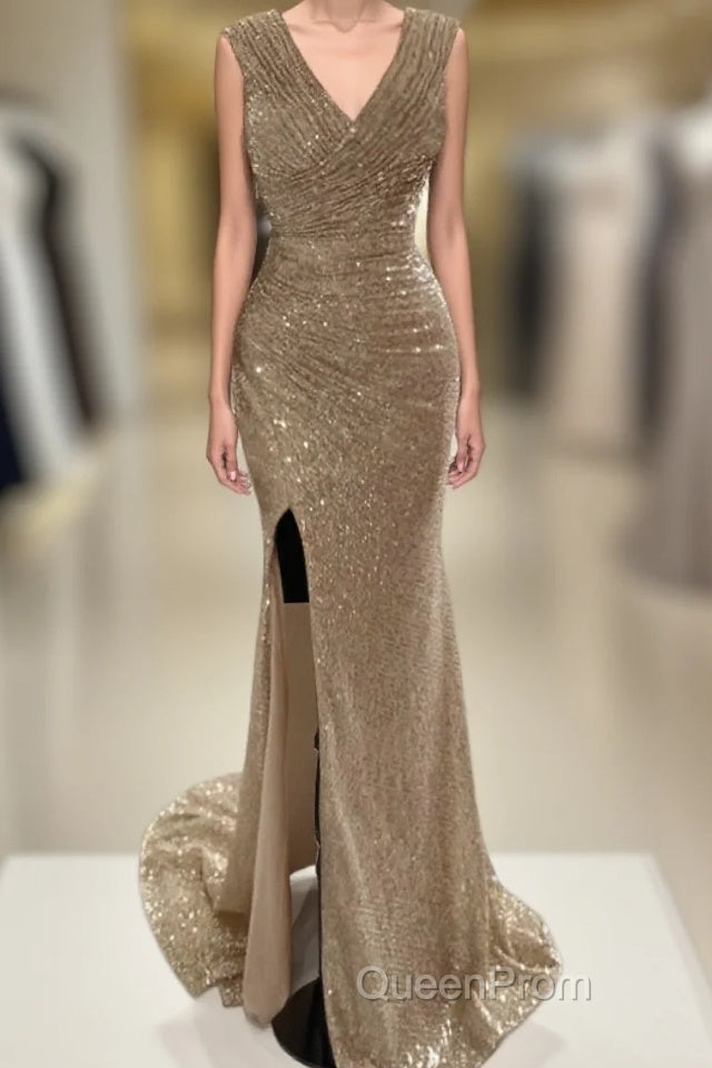 Sheath / Column Evening Prom Dresses Sparkle & Shine Dresses Cocktail Party Sweep / Brush Train Sleeveless V Neck Sequined With Glitter Ruched Slit
