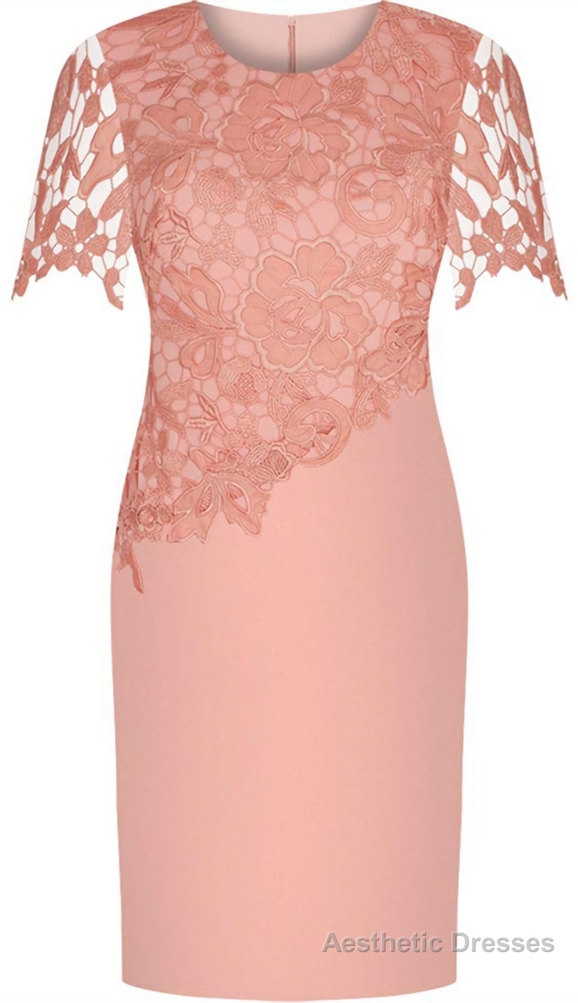 Sheath Round Neck Short Sleeves Prom Elastic Satin Short Mother Of The Bride Dress, With Lace