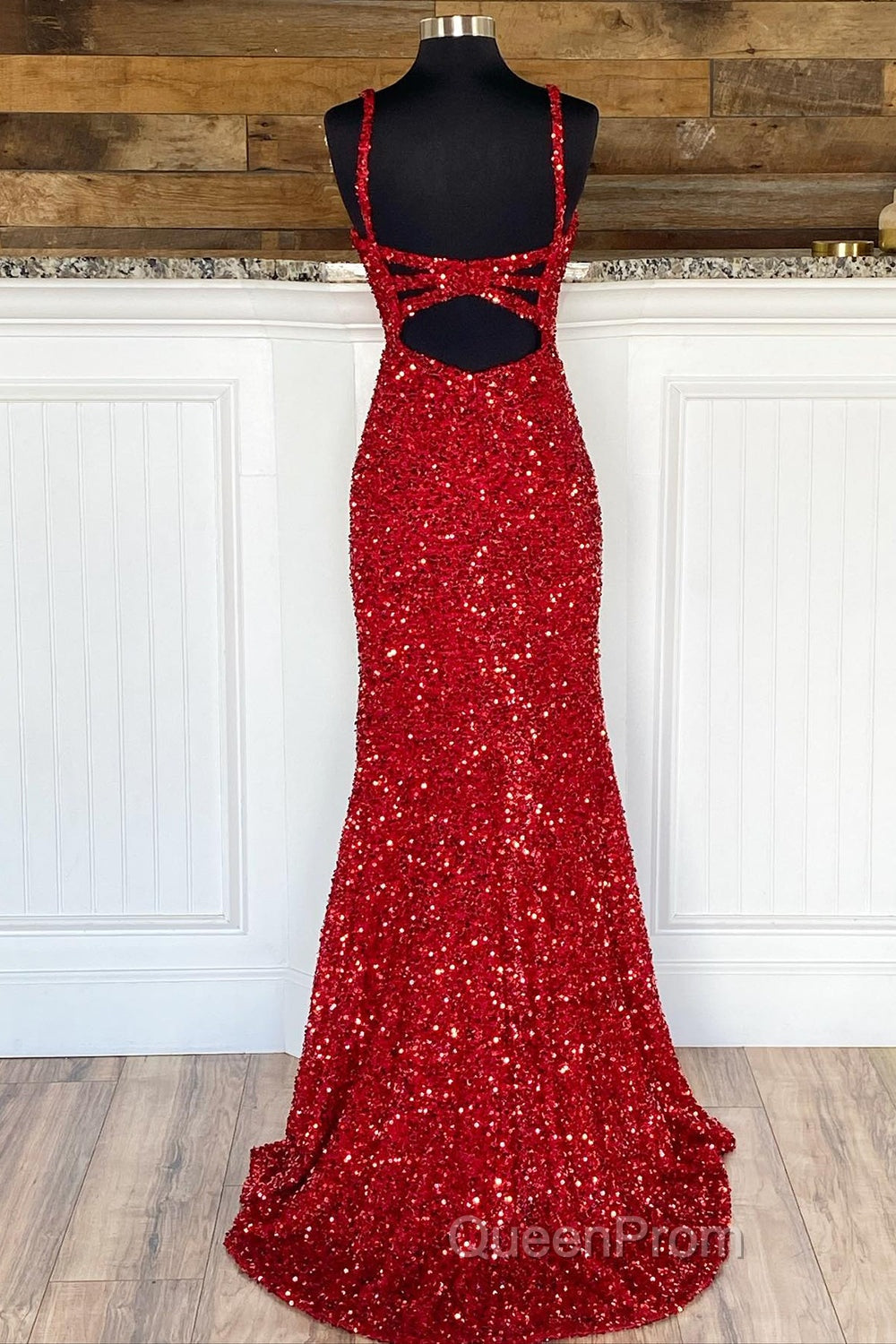 Sheath Spaghetti Straps Red Sequins Evening Prom Dresses with Split Front