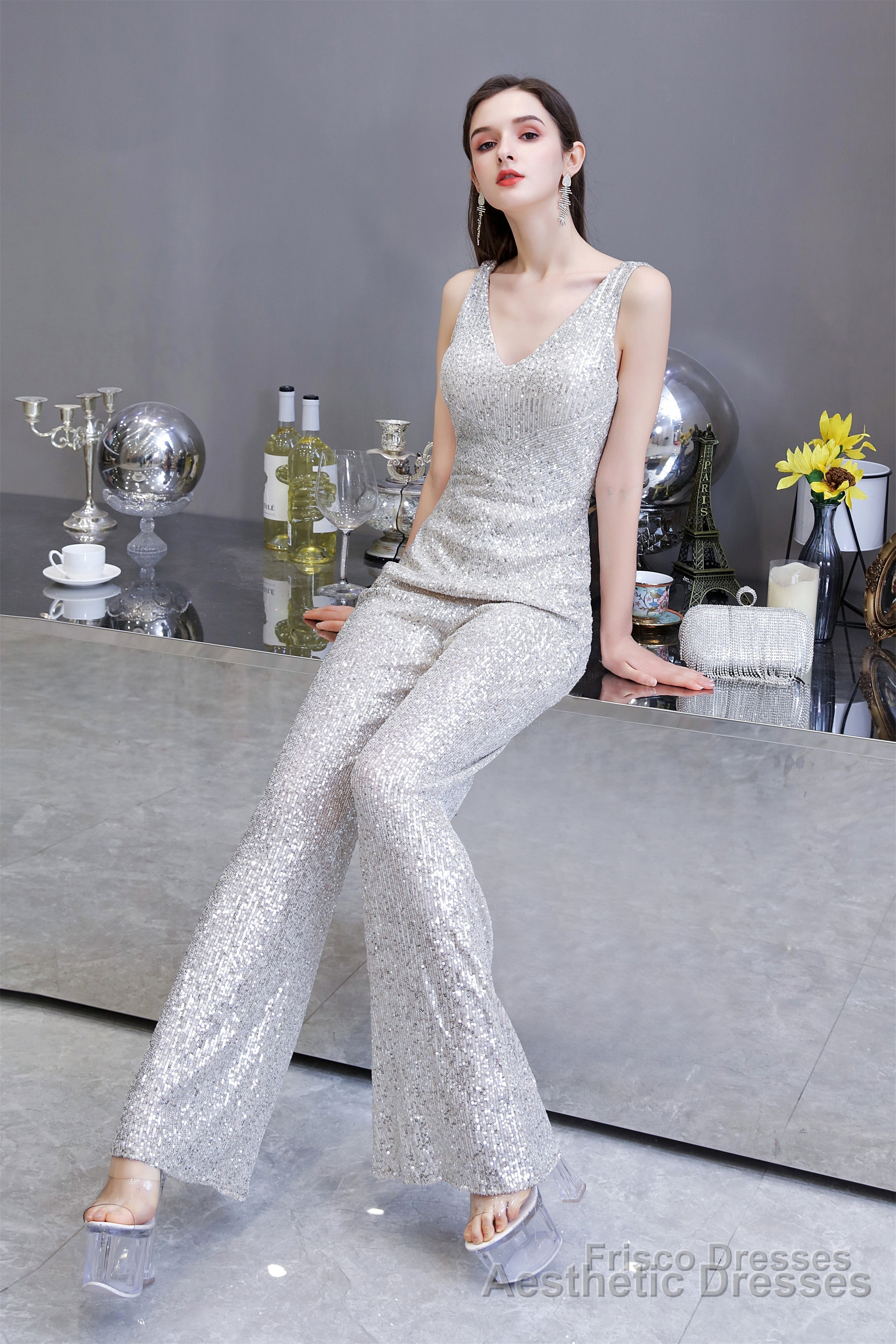 This dazzling V-neck jumpsuit is adorned with sparkling sequins, making it the perfect statement piece for any prom. Its sleeveless design adds a touch of sophistication, while the sequins add a touch of glam.