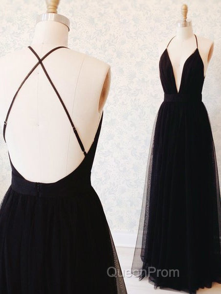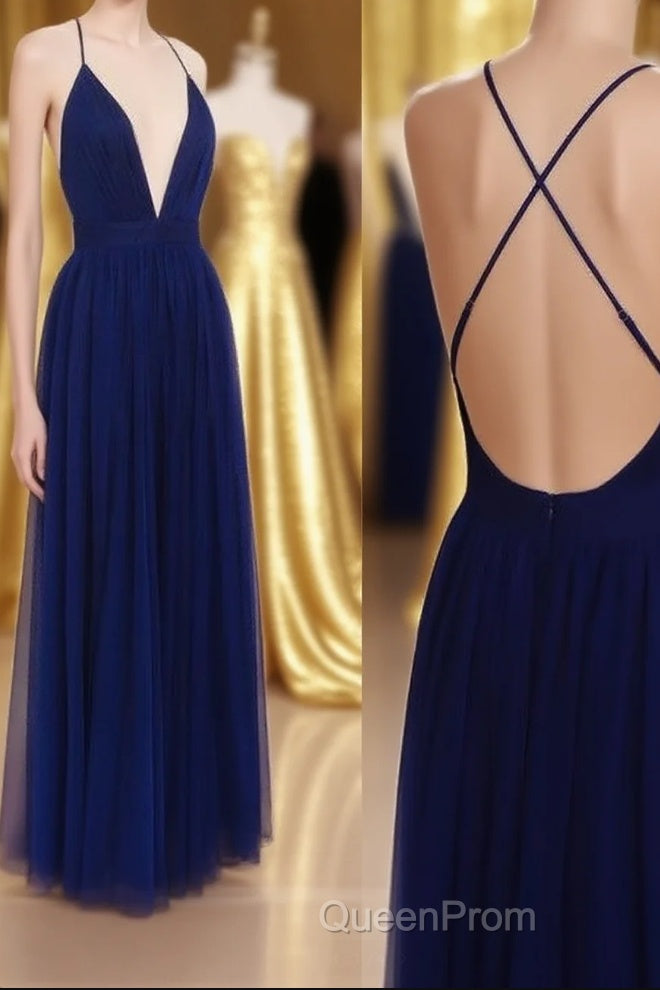 Simple A-line V Neck Navy Blue Long Evening Prom Dresses
