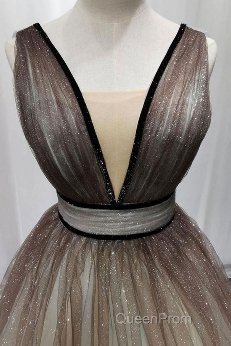 Simple Coffee tulle sequin long Evening Prom Dresses coffee evening Dresses