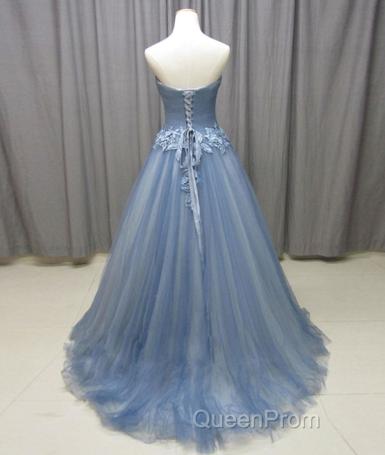 Simple gray blue tulle lace applique long Evening Prom Dresses, tulle evening Dresses