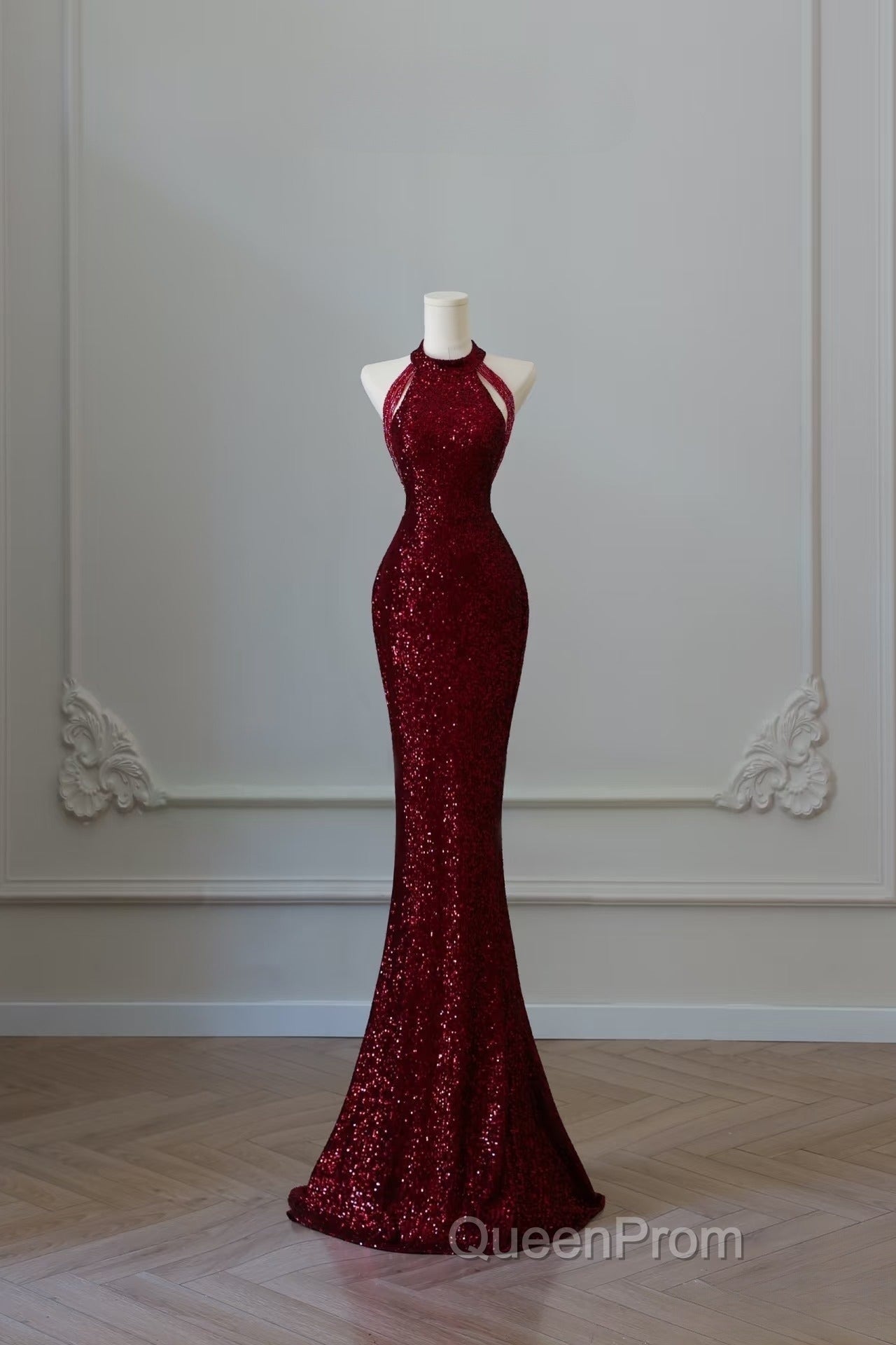 Simple Mermaid Scoop Neckline Burgundy Sequin Long Party Dresses Evening Prom Dresses