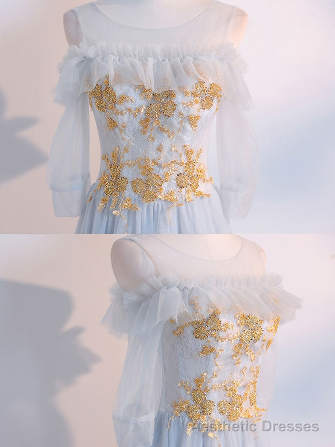 Simple Tulle Lace Gray Blue Prom Dresses, Tea Length Lace Bridesmaid Dresses