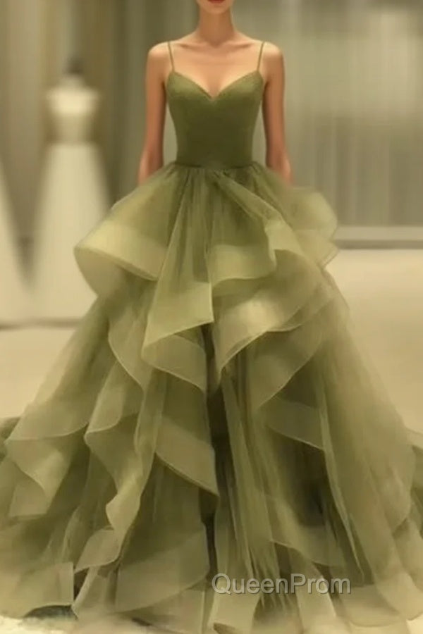 Spaghetti Strap Green A Line Long Evening Prom Dresses Formal Evening Gown Party Dresses