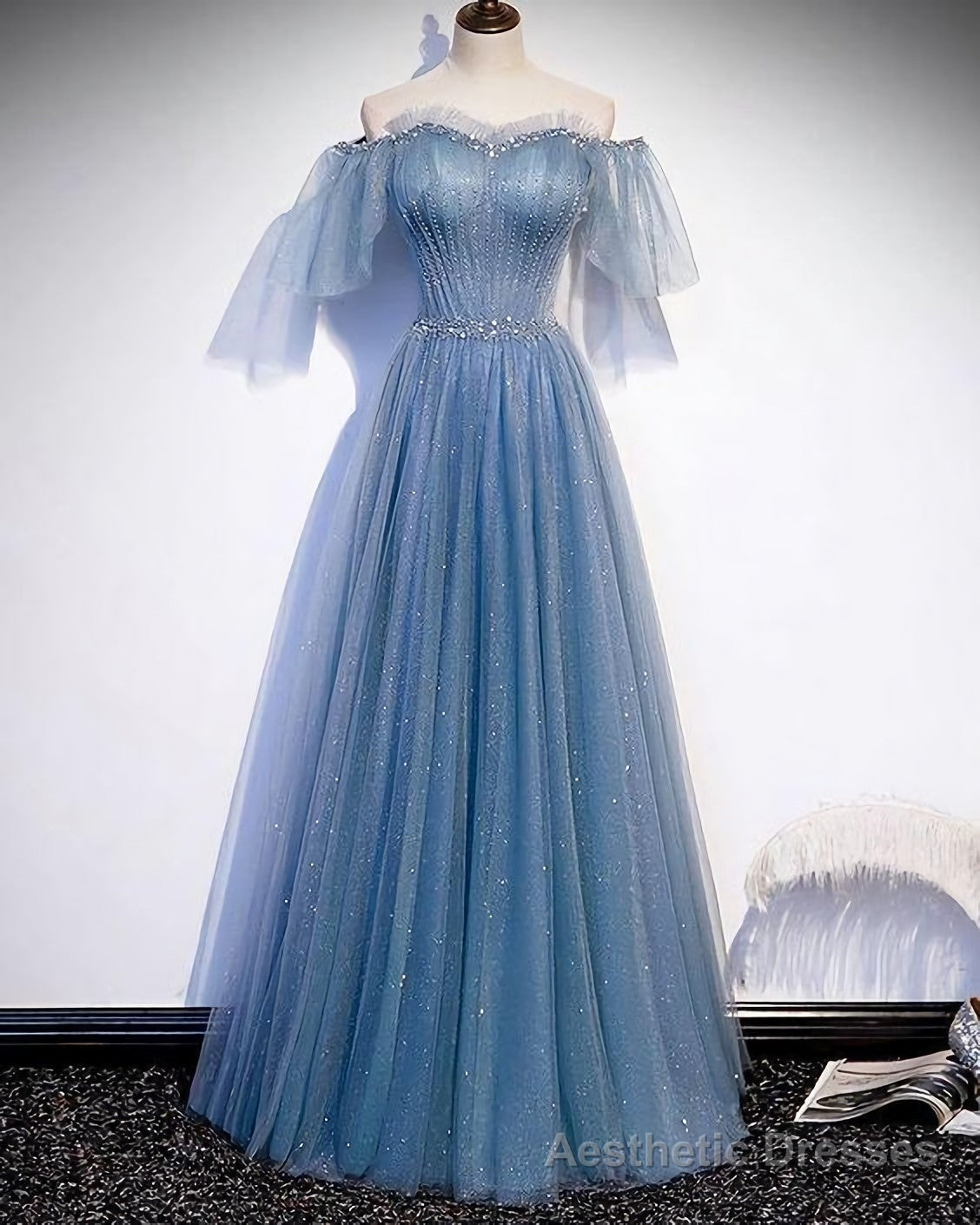 Sparkly Gorgeous A Line Off The Shoulder Dusty Blue Tulle Prom Dresses With Beading