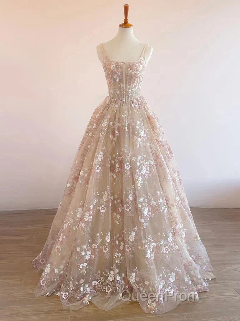 Sweet Light Champagne A-Line Tulle Sequin Applique Long Evening Prom Dresses Evening Prom Dresses Birthday Dresses