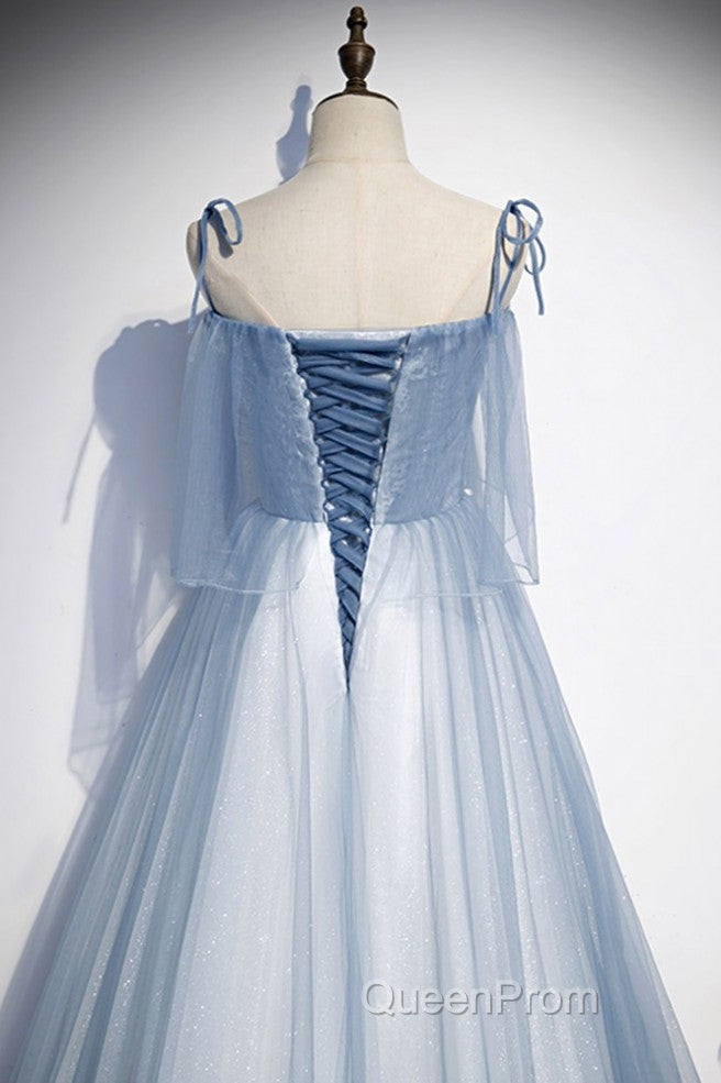 Sweet Sky Blue Thin Shoulder Strap Sleeveless Applique Lace Bead Dresses Dresses With Sky Blue A-Line Glittering Thin Gauze Open Back Strap Long Ruffle Edge Evening Dresses