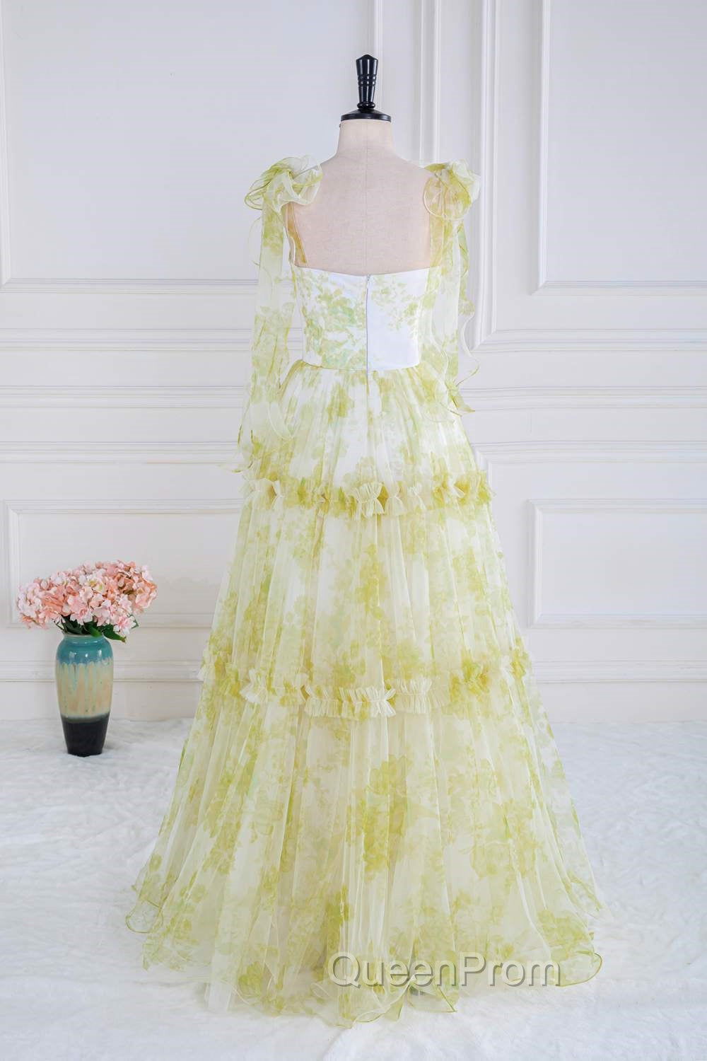 Tie Straps Yellow Floral Print Ruffles Tulle Long Evening Prom Dresses