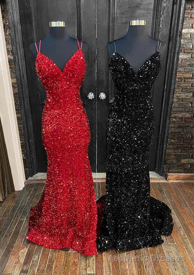 Trumpet/Mermaid V Neck Sleeveless Velvet Sequins Court Train Prom Dress With Pleated