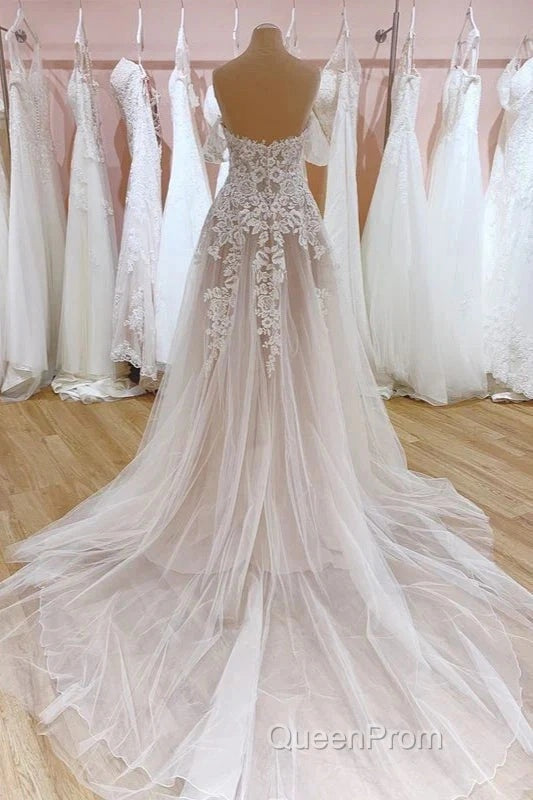 Tulle Lace Wedding Dresses Off The Shoulder A-Line Bridal Dresses With Sweep Train Elegant
