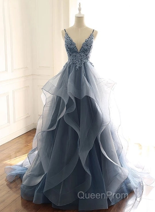 Tulle Long Evening Prom Dresses With Spaghetti Straps And Ruffled Floor Length Skirt